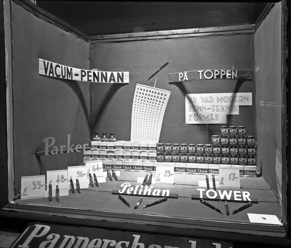 Hedmans Bokhandel. Skyltfönstertemat är "Pelikan Tower"