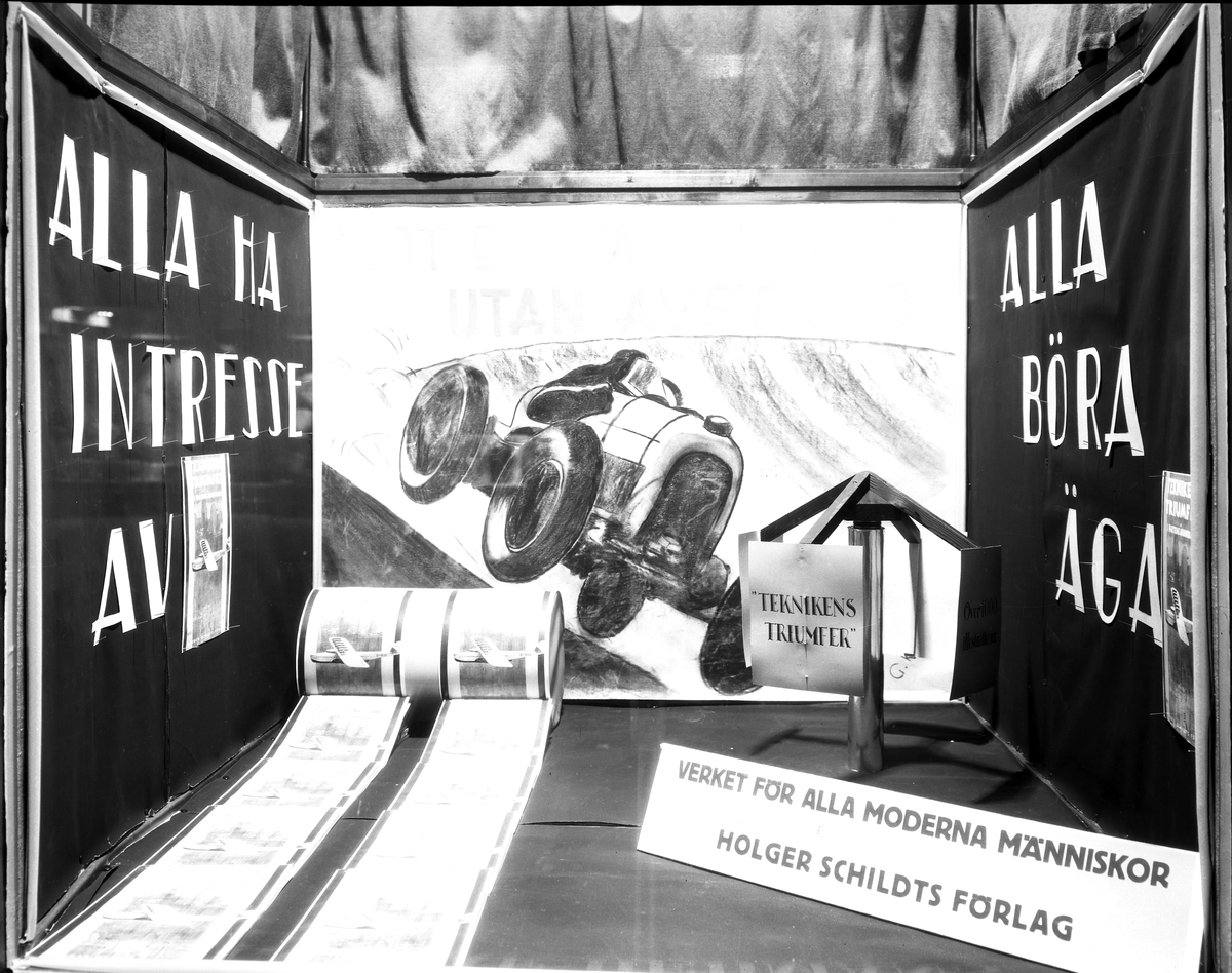 Hedmans Bokhandel. Skyltfönstertemat är "Teknikens Triumfer"