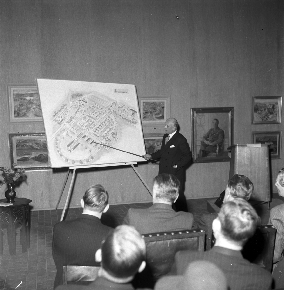 Stadsdirektör Camitz håller föredrag på museet. 1945.