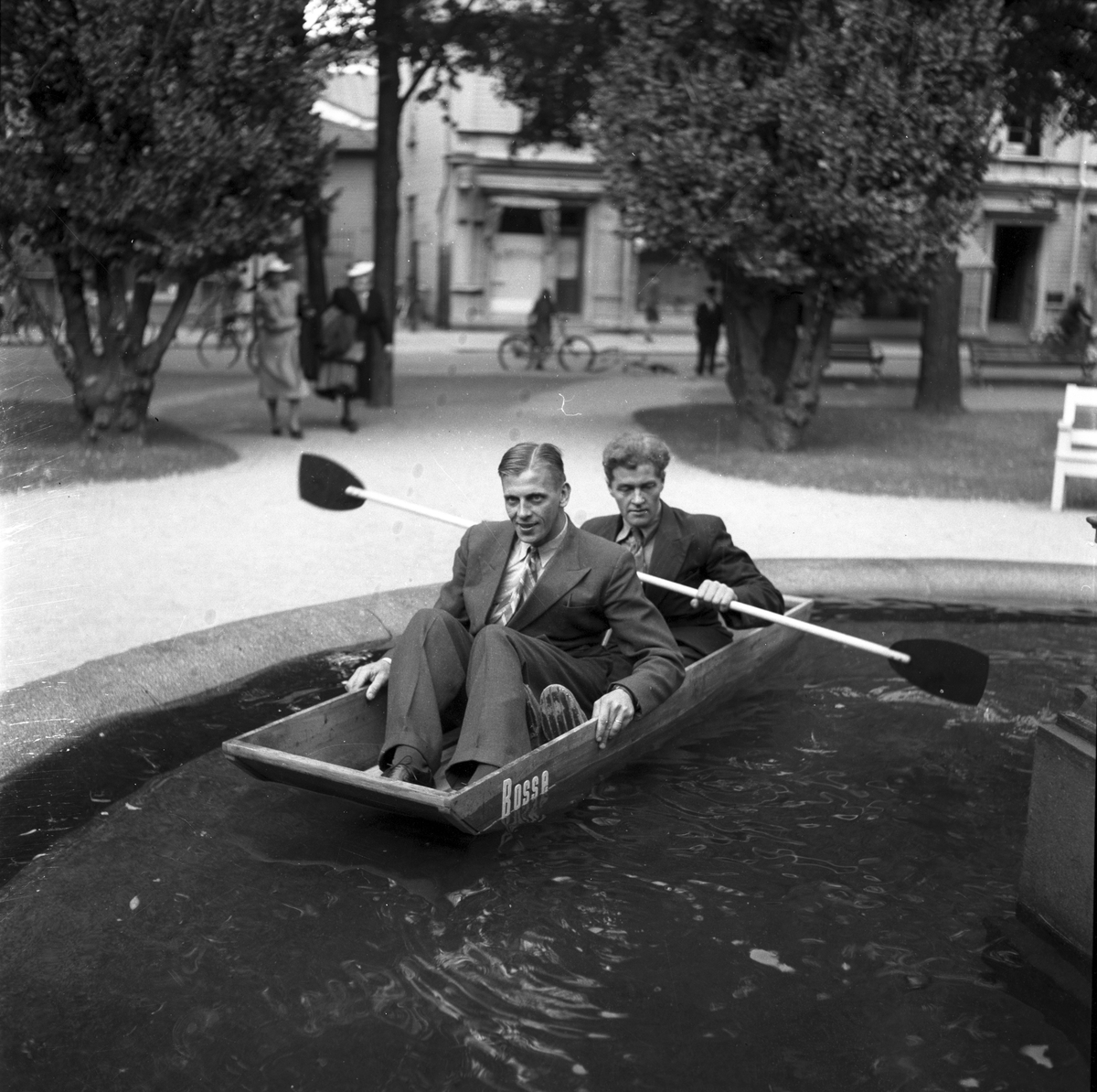 Två män i en båt. Konsum Alfas båt "Bosse" i fontänen. 1945.