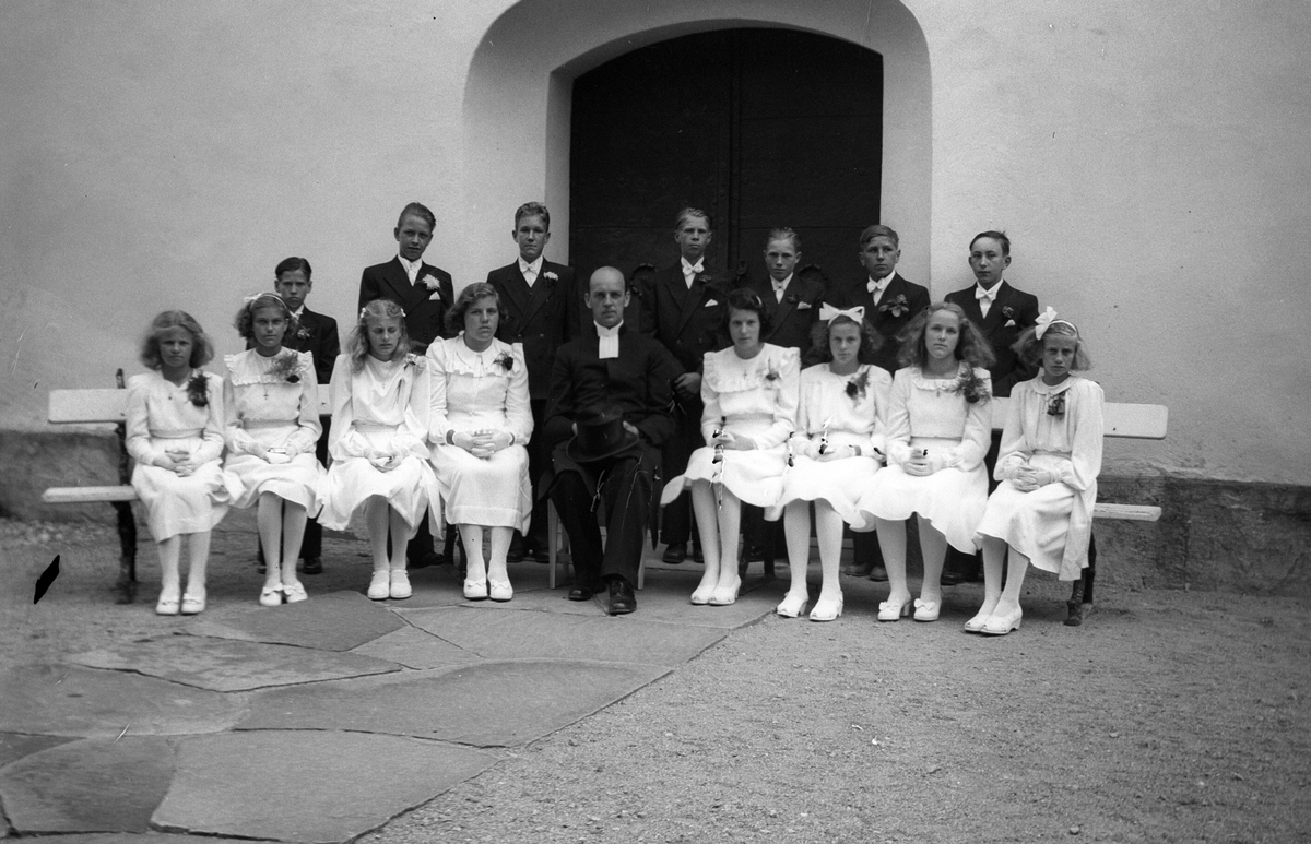 Komminister Eriksson med konfirmander utanför Valbo kyrka. 1946.