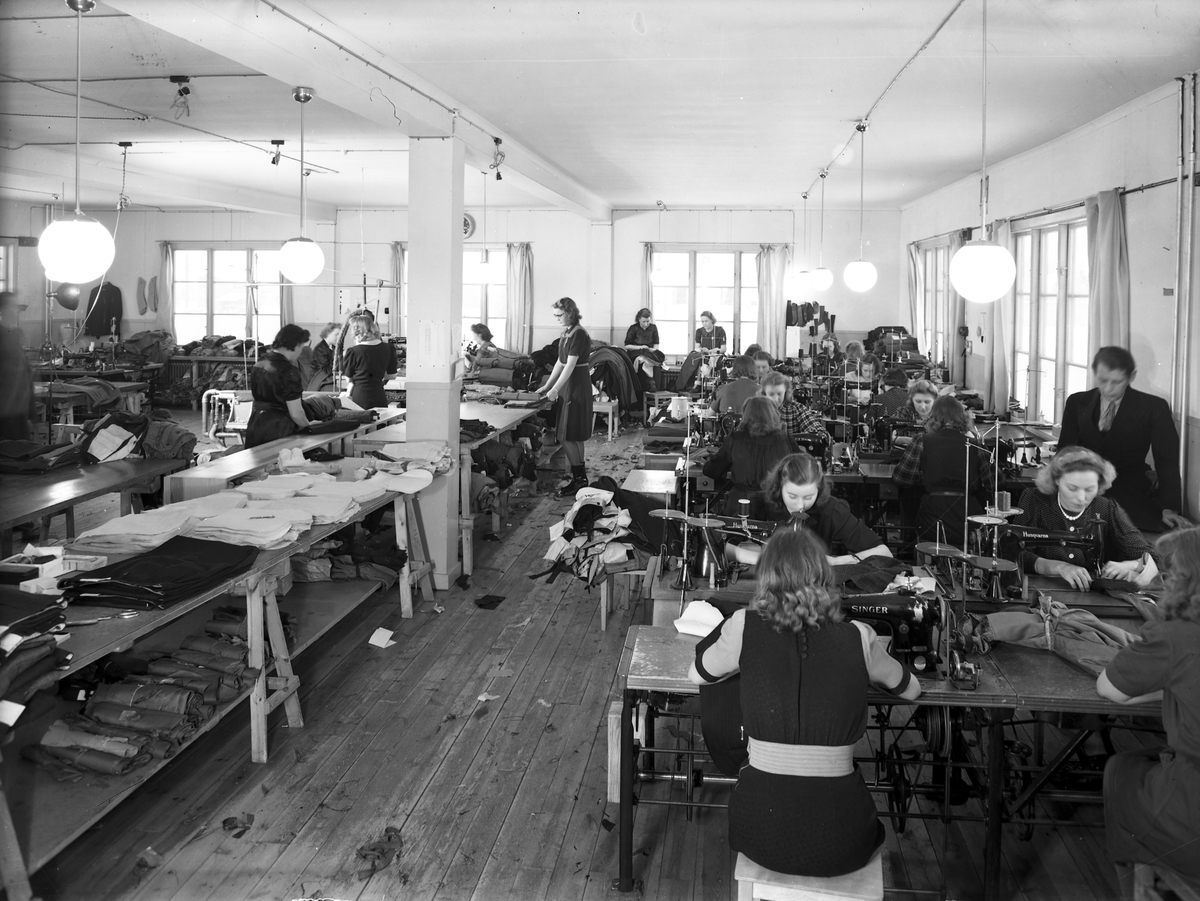 Interiör från Tierps syfabrik. Oktober 1944. År 1931 byggdes SABÖ Syfabriks Aktie Bolaget Örbyhus syfabrik. Syfabriker i Örbyhus och Tierp båda i Uppsala län Tillverkar herr-och gosskläder, damkappor och dräkter samt skiddräkter. Varumärken: SABÖ och ÖRSY.