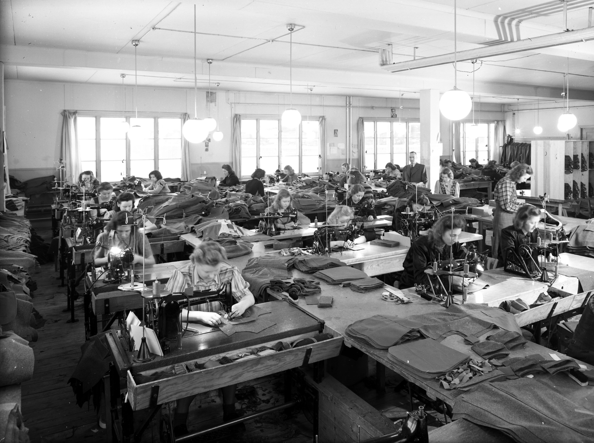 Interiör från Tierps syfabrik. Oktober 1944. År 1931 byggdes SABÖ Syfabriks Aktie Bolaget Örbyhus syfabrik. Syfabriker i Örbyhus och Tierp båda i Uppsala län Tillverkar herr-och gosskläder, damkappor och dräkter samt skiddräkter. Varumärken: SABÖ och ÖRSY.