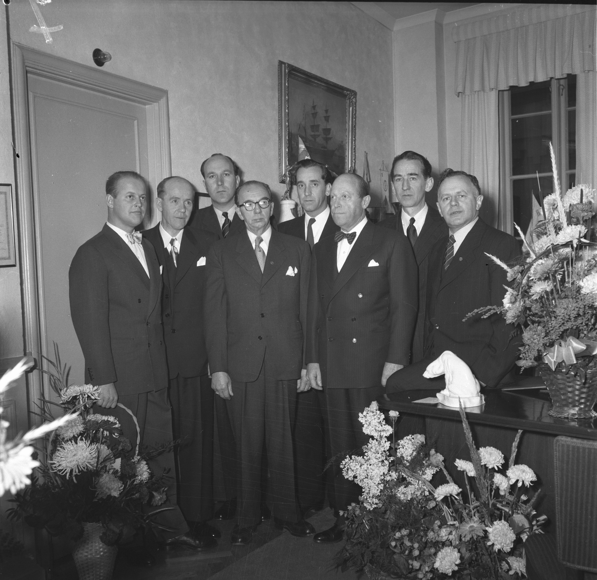 Engwalls Victor Theodor o Co. Grupp med åtta herrar från jubileet. 25 november 1953.