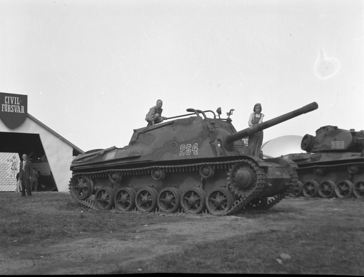 Föreställer en pvkv m/43 (pansarvärnskanonvagn) tillverkade av Landsverk i Landskrona. I bakgrunden syns en stridsvagn m/42 också den från Landsverk.
