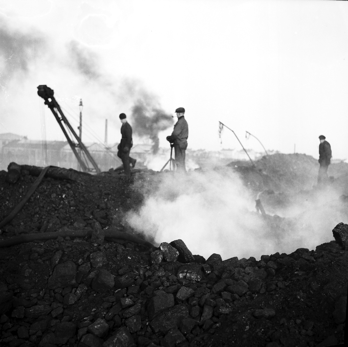 Reportage för Arbetarbladet. Kolmagasinet, eld i kolupplag. Kolhögarna brinner