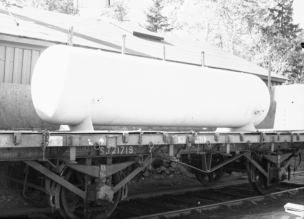 "Klocka" på järnvägsvagnen. 9 september 1942. Gävle Varv anlades 1873. Efter en konkurs 1921 bildades Gefle Varfvs och Verkstads Nya AB, som bland annat tillverkade oljecisterner och utrustningar till pappersmassefabriker. På 1940-talet återupptogs skeppsbyggeriet.