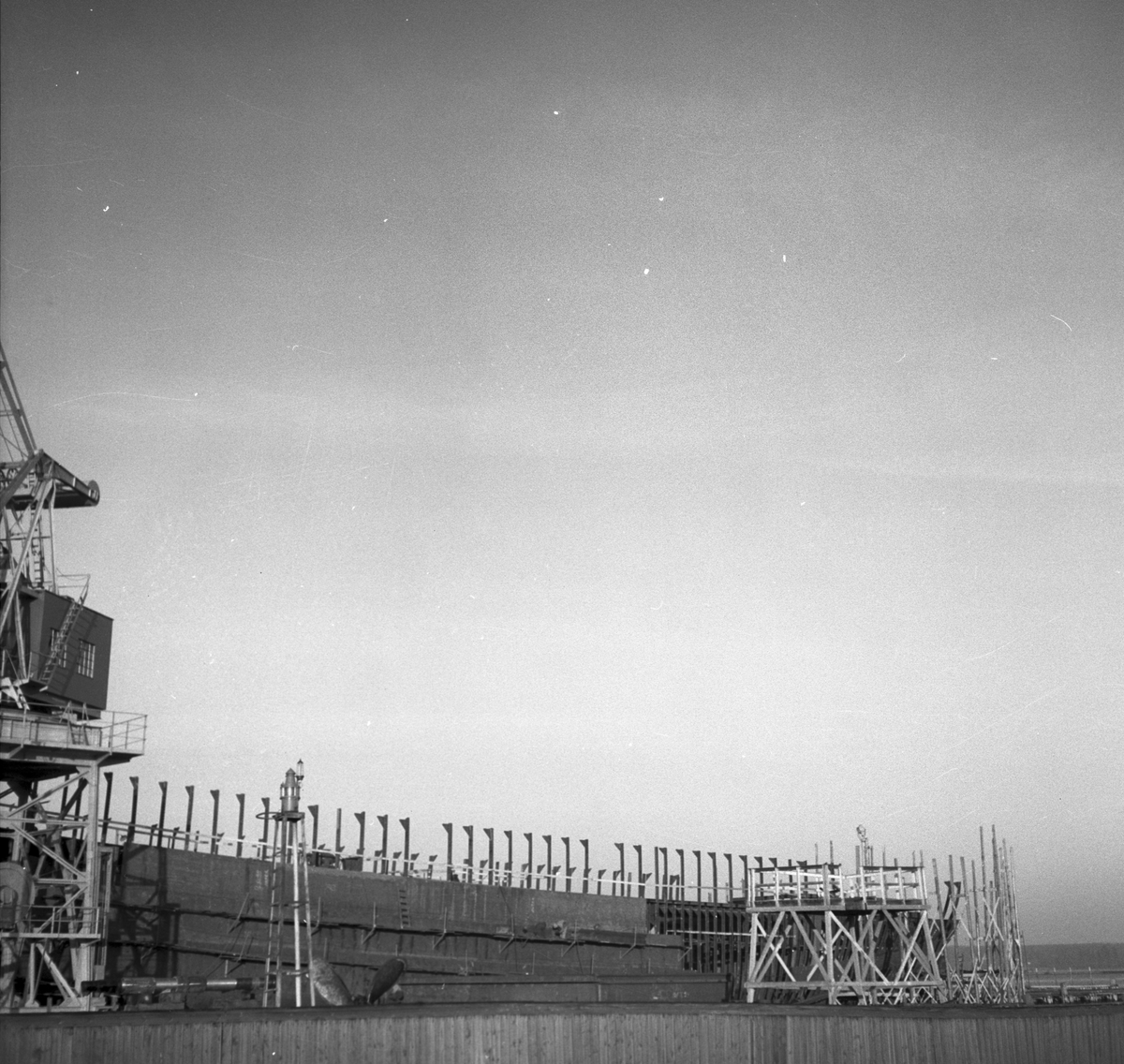 Reportage för Gefle Dagblad. 6 augusti 1948. Gävle Varv anlades 1873. Efter en konkurs 1921 bildades Gefle Varfvs och Verkstads Nya AB, som bland annat tillverkade oljecisterner och utrustningar till pappersmassefabriker. På 1940-talet återupptogs skeppsbyggeriet.