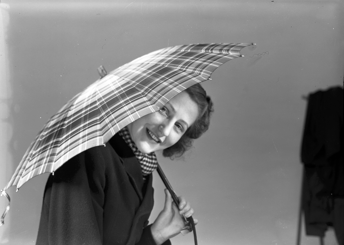 Dam med paraply. Mars 1945. Gävle Portföljfabriken. Firman startade år 1917 av fabrikör Hj. Jakobson. Verksamheten omfattade tillverkning av väskor, portföljer, portmonnäer och plånböcker. Sedermera upptogs även tillverkning av provväskor och damväskor. Vid fabrikör Hj. Jakobsons frånfälle år 1937 övertogs rörelsen av sonen, Herbert Jakobson . Firman är inrymd i Centralpalatset vid Norra Centralgatan 6, där den förfogar över såväl verkstads- som affärslokaler. Reparationer utföras av olika inom branschen förekommande arbeten.