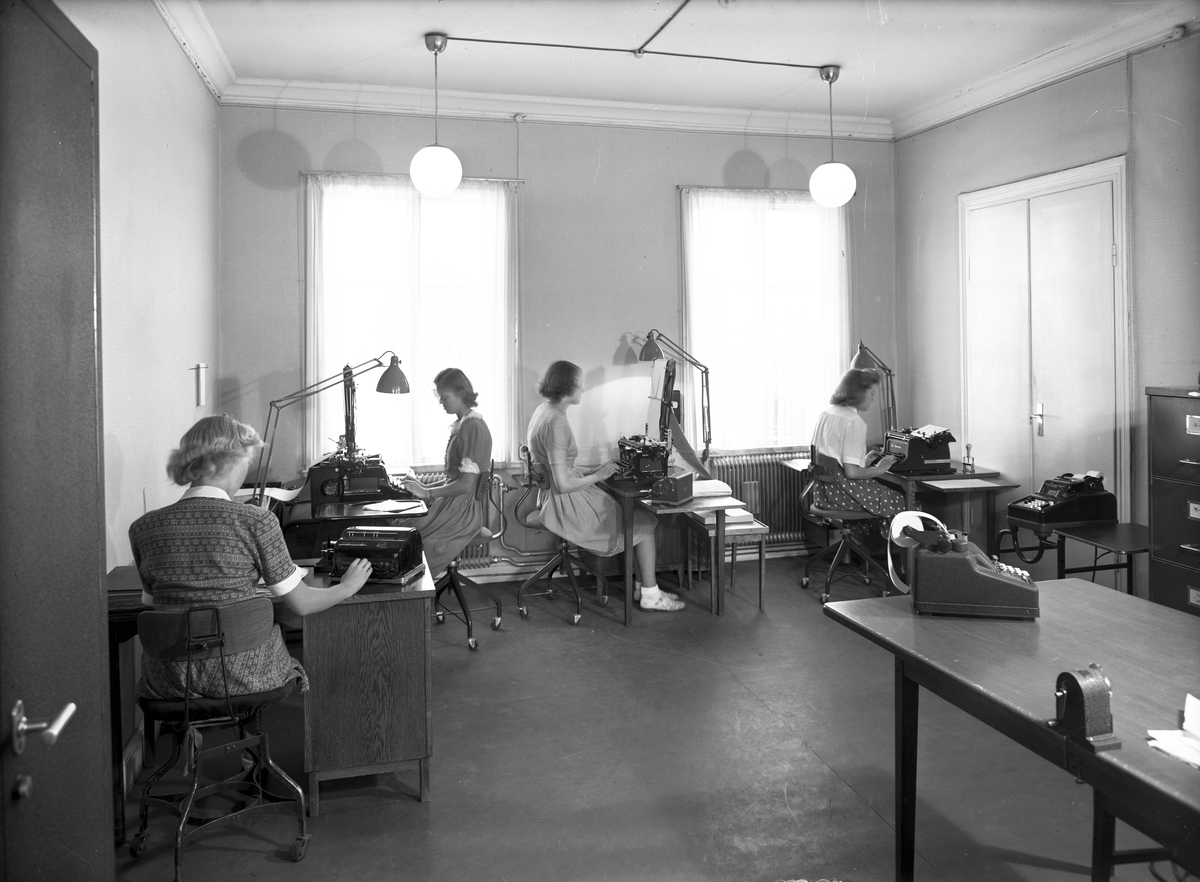 Gävle Dala Lantmannförbund kontor. Interiör med personal. Augusti 1945.