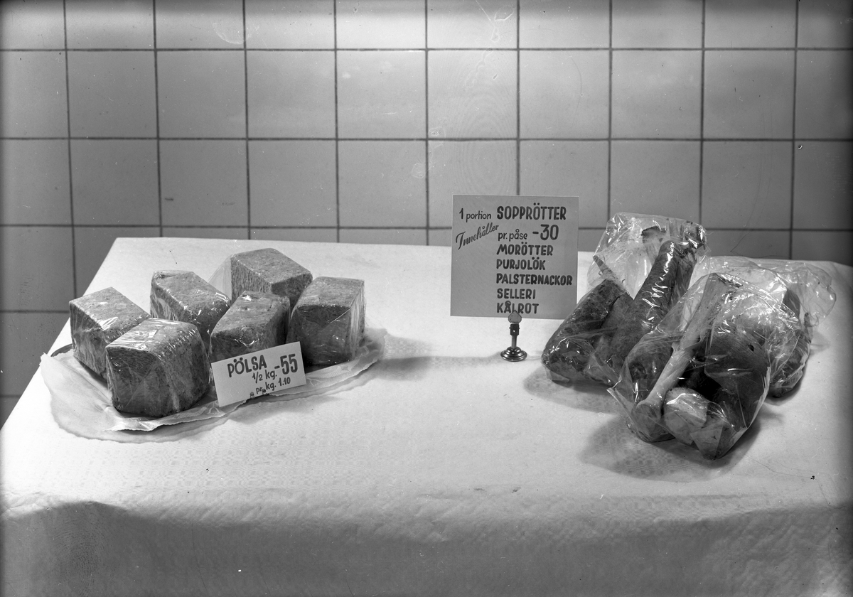 Rotfrukter och pölsa. Konsum Alfa, Valbogatan 33, Gävle. 1946.