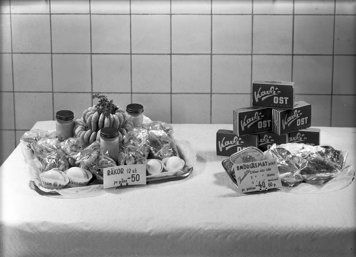 Räkor och smörgåsmat. Konsum Alfa, Valbogatan 33, Gävle. 1946.