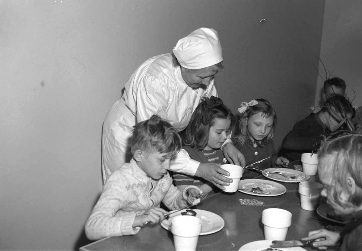 Barnbespisning vid Brynässkolan. 5 april 1949. Reportage för Arbetarbladet.