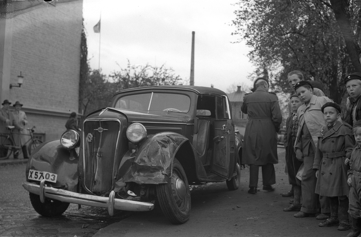 Bilolycka korsningen Drottninggatan och Kaplansgatan. 19 oktober 1949.