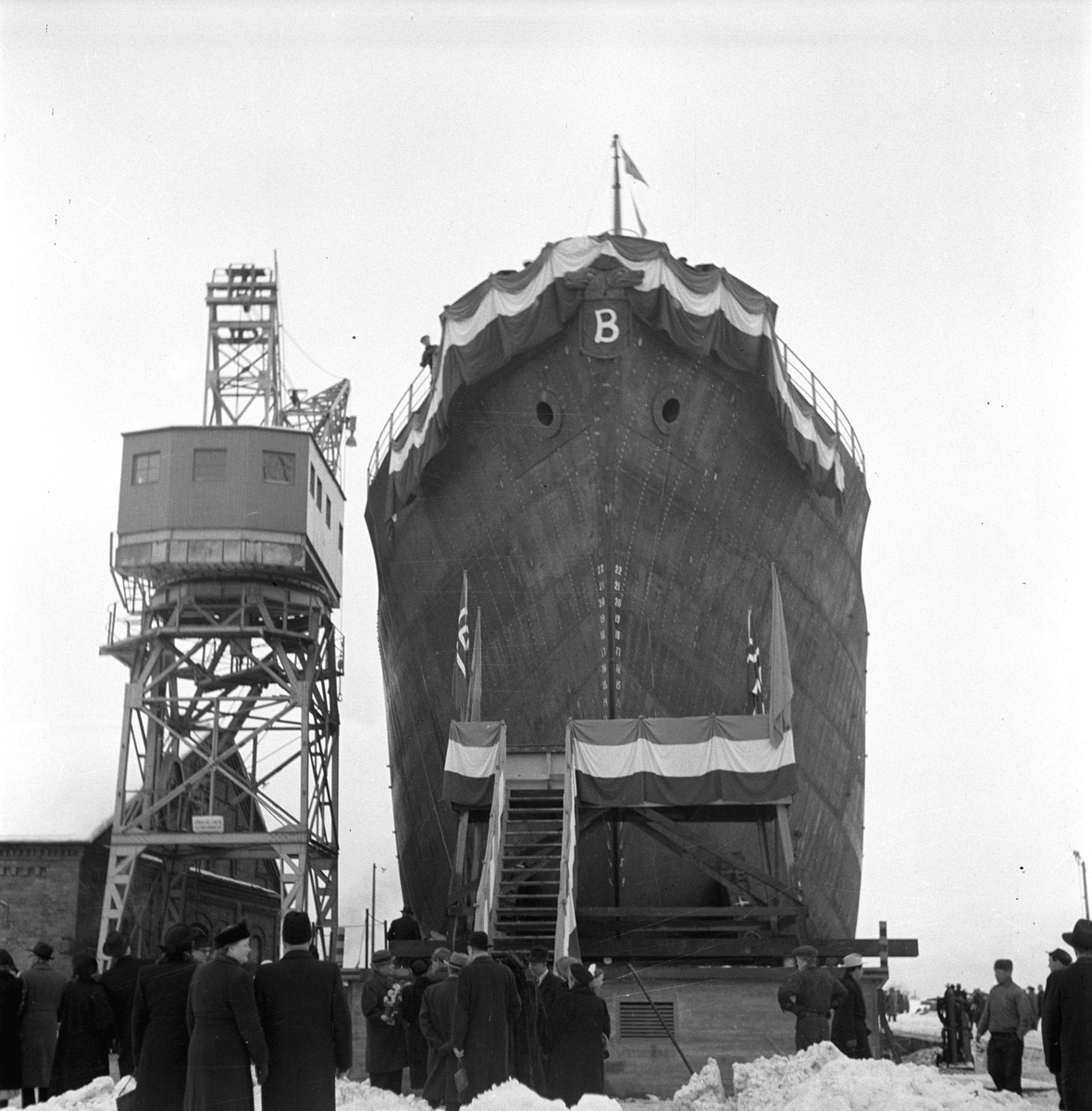 Gävle Varv från "Gezina Brövings" stapelavlöpning. 14 januari 1950.