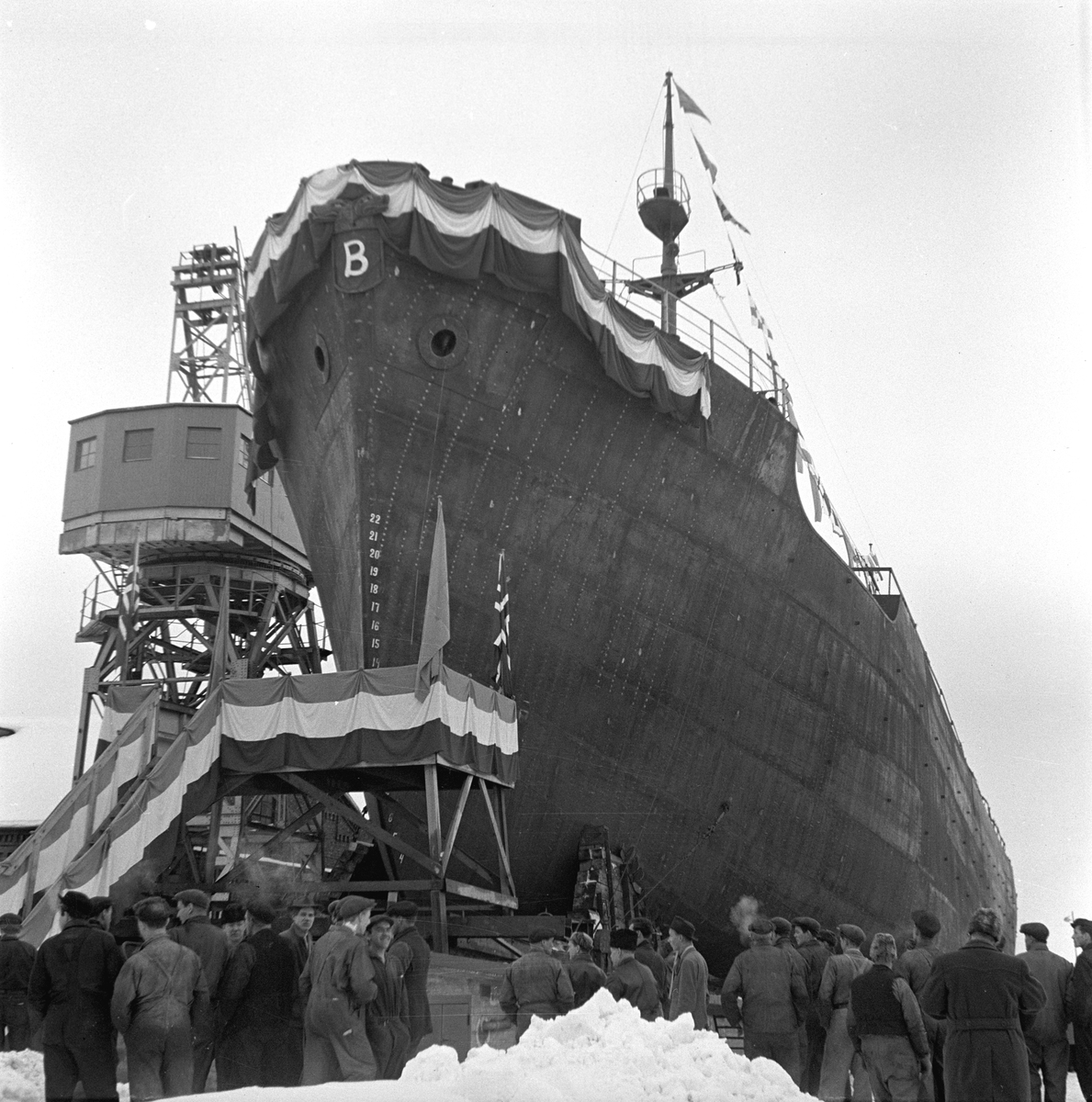 Gävle Varv från "Gezina Brövings" stapelavlöpning. 14 januari 1950.