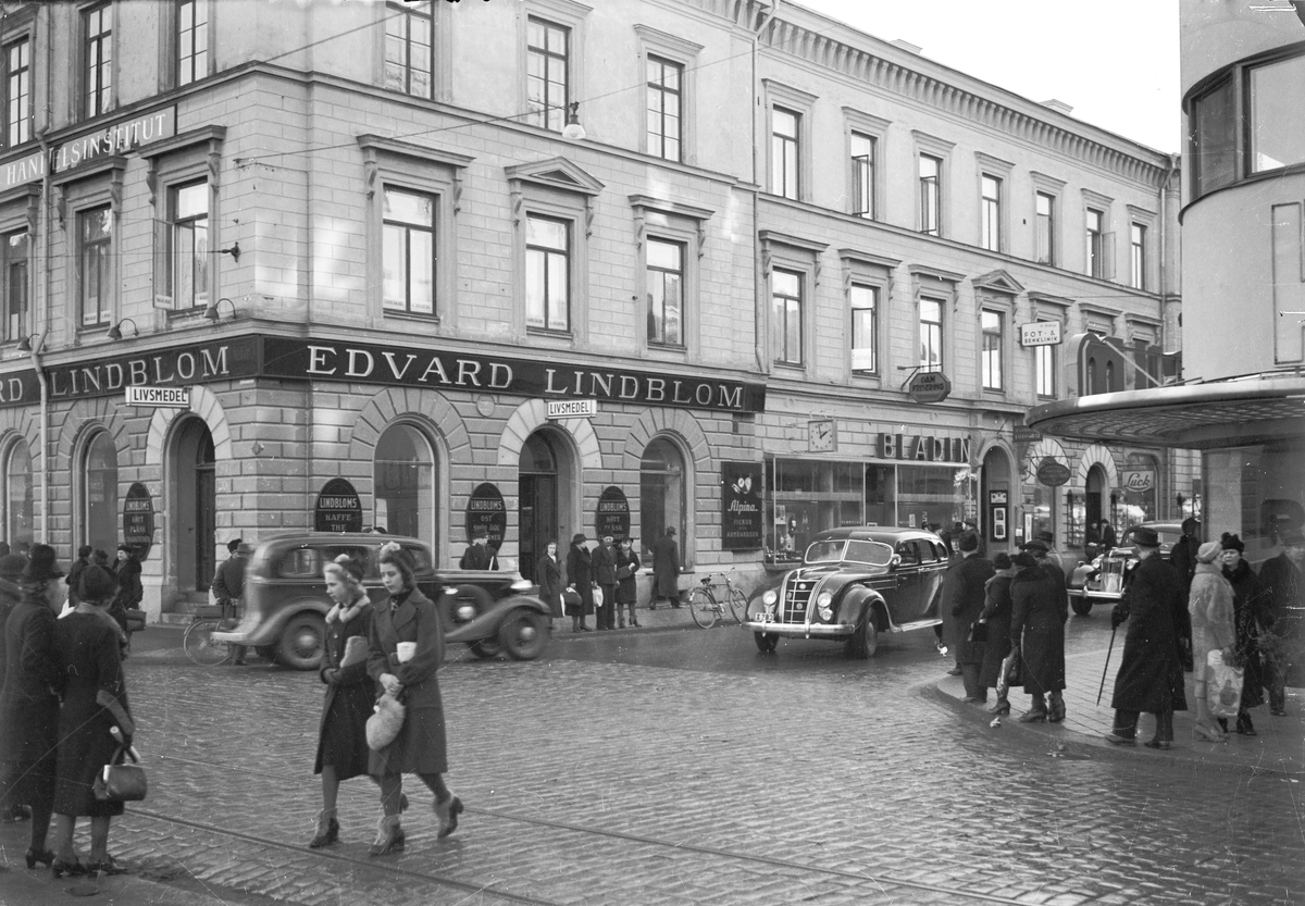 Korsningen Norra Kungsgatan och Drottninggatan med Varuhuset Konsum och Edvard Lindbloms Livmedelsaffär