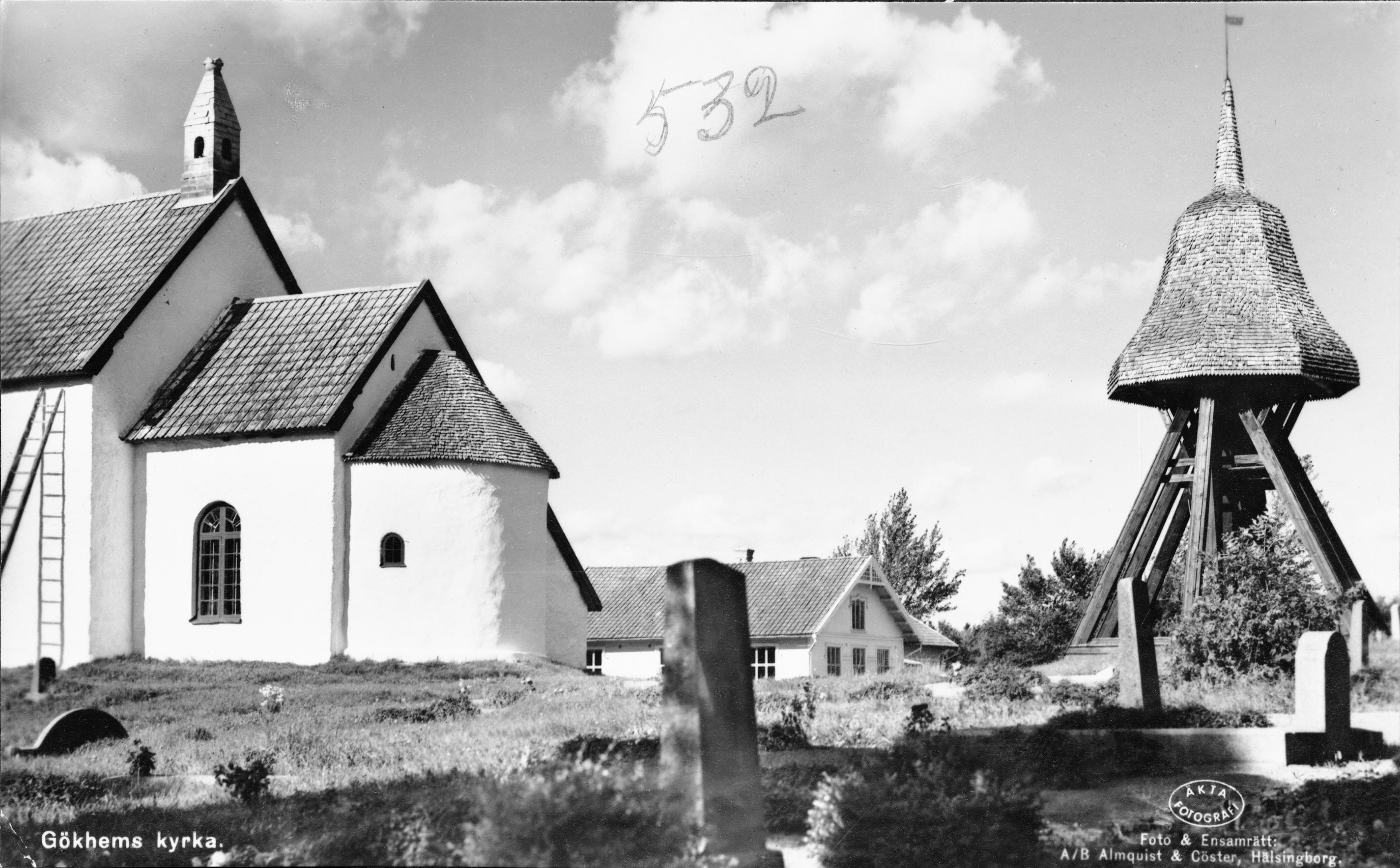 Kor, korabsid och klockstapel från sydöst. Vykort.