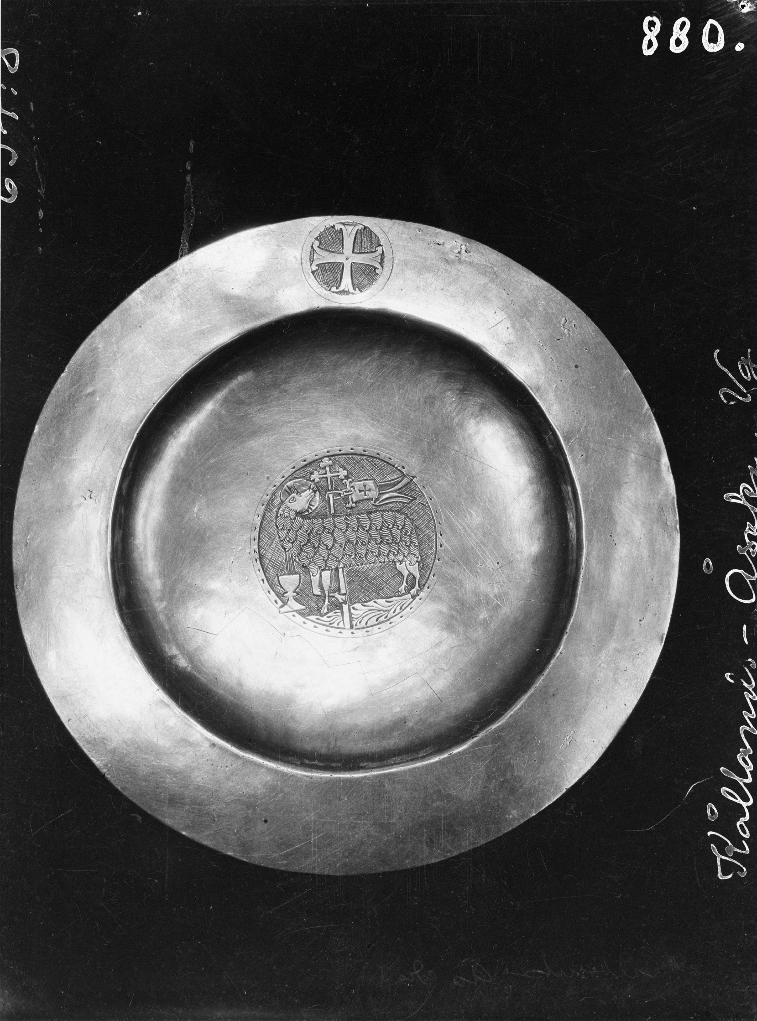 Patén, silver, mittgravyr med lamm med korsfana, 1400-talet.