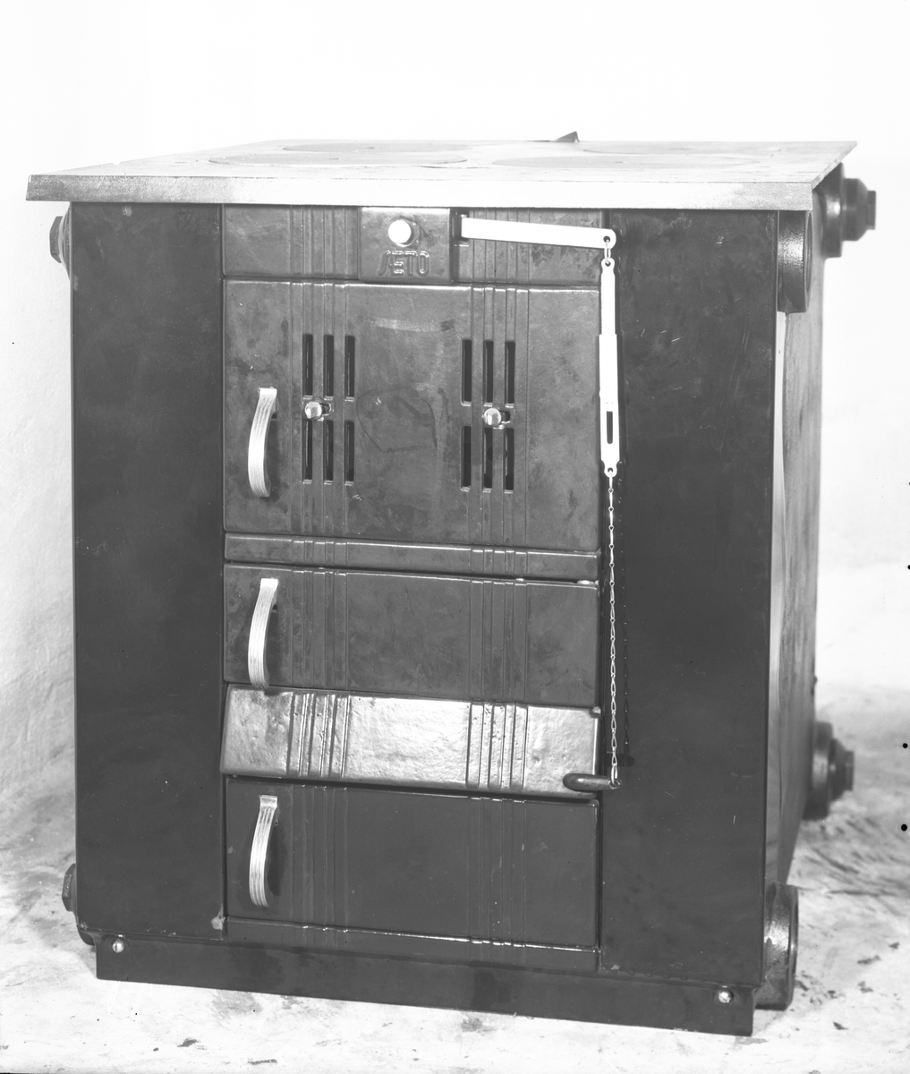 Titel: AB Skoglund & Olson. Gefle. Gjuteri och Mekanisk Verkstad. Känt för bland annat järnspisar och leksaker. Företaget startades 1874 av Erik Gustaf Skoglund och Axel Olsson. Firman blev aktiebolag 1914 och hade på 1930-talet cirka 260 anställda i produktionen och ett 30-tal på kontoret. Spis
