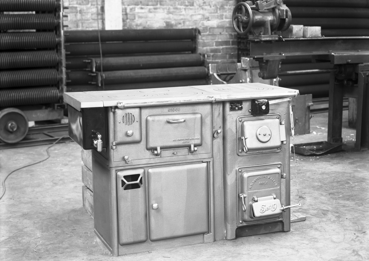 Titel: AB Skoglund & Olson. Gefle. Gjuteri och Mekanisk Verkstad. Känt för bland annat järnspisar och leksaker. Företaget startades 1874 av Erik Gustaf Skoglund och Axel Olsson. Firman blev aktiebolag 1914 och hade på 1930-talet cirka 260 anställda i produktionen och ett 30-tal på kontoret. Spis