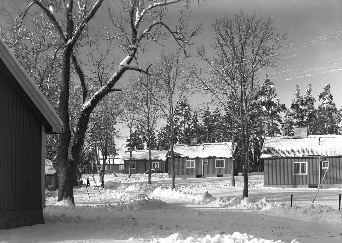 Grinduga. Den 7 februari 1955. En tendens i skogsbruket är att samla skogsarbetarna i moderna skogsarbetarbyar.