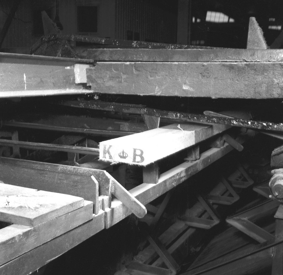 Sågverket. Korsnäs AB April 1955. I virkessorteringen sorteras, märkes och mätes virket.