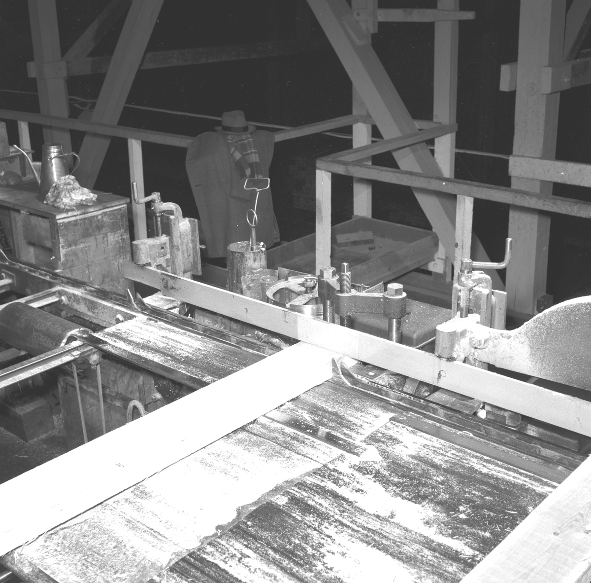 Sågverket. Korsnäs AB April 1955. I virkessorteringen sorteras, märkes och mätes virket.
