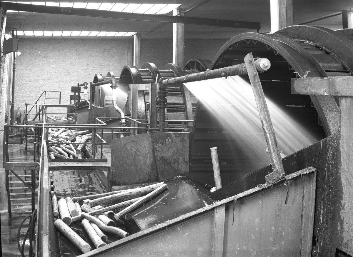 Sulfitfabriken. Korsnäs AB. Den 14 april 1955. I barktrumman befrias sulfitveden från barken