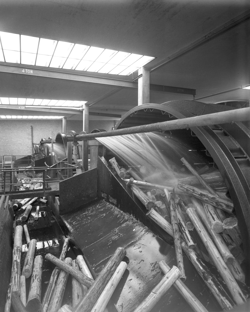Sulfitfabriken. Korsnäs AB. Den 14 april 1955. I barktrumman befrias sulfitveden från barken