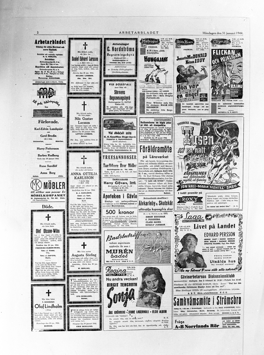 En sida av Arbetarbladet Måndagen den 31 januari 1944. Blandat med bioannonser och dödsannonser.