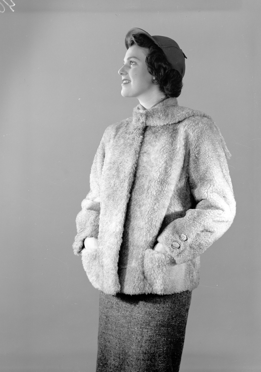 Titel: Pälsjacka. L. Haglund & Co, med varumärket Elhå. Grundades som en affär för mössor, hattar och pälsvaror av Lars Haglund 1872. Den 25 oktober 1955