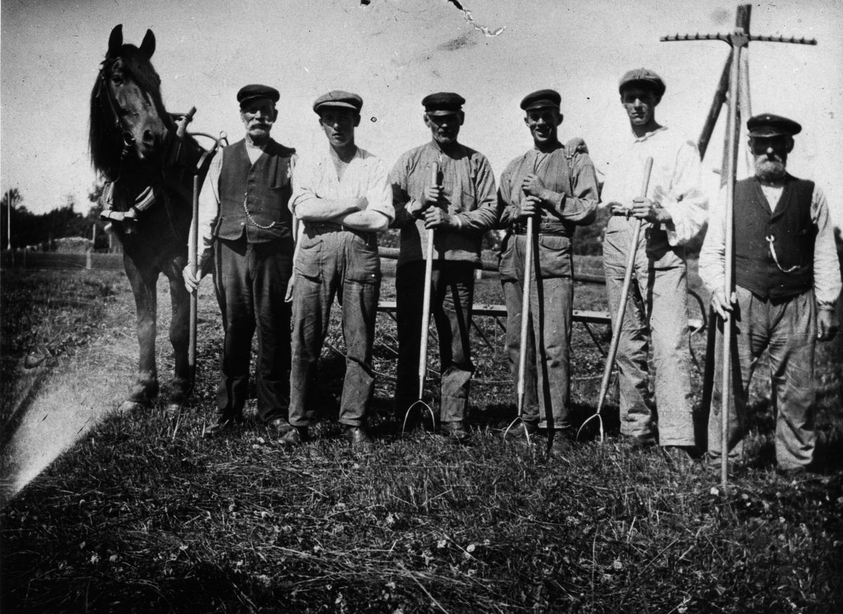 Jordbruksarbetare. Tredje mannen från vänster är Wahlström, fjärde mannen Gunnar Boman.