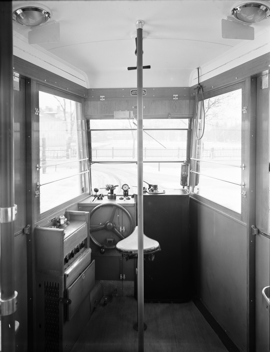 Gefle Stads Spårvägar. Interiör av en förarhytt.