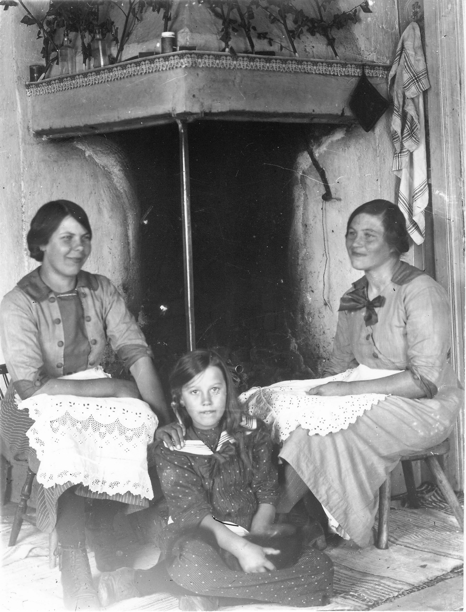 Bergsängets fäbod (Bergsänge). Kvinnan till vänster är Anna Nilsson ("Nilses-Anna"), född 1895, kvinnan till höger Marta Hansson ("Per-Ers"), född 1894. I mitten sitter lillpigan Stina Frisk, ("Kasänge"), född Eriksson, 1905. Stina och Marta var kusiner.