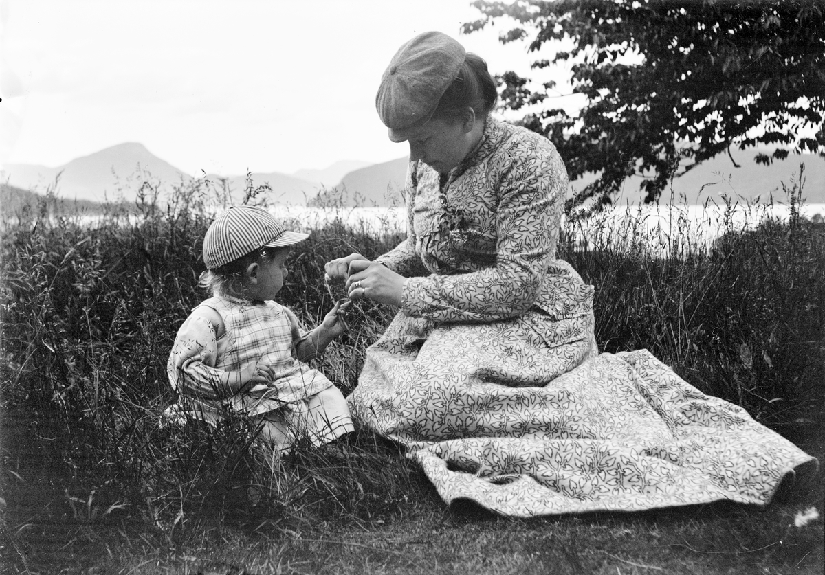 Christiane Liljefors sitter ute på gräsmattan med sin lilla dotter Marit, sannolikt i Norge