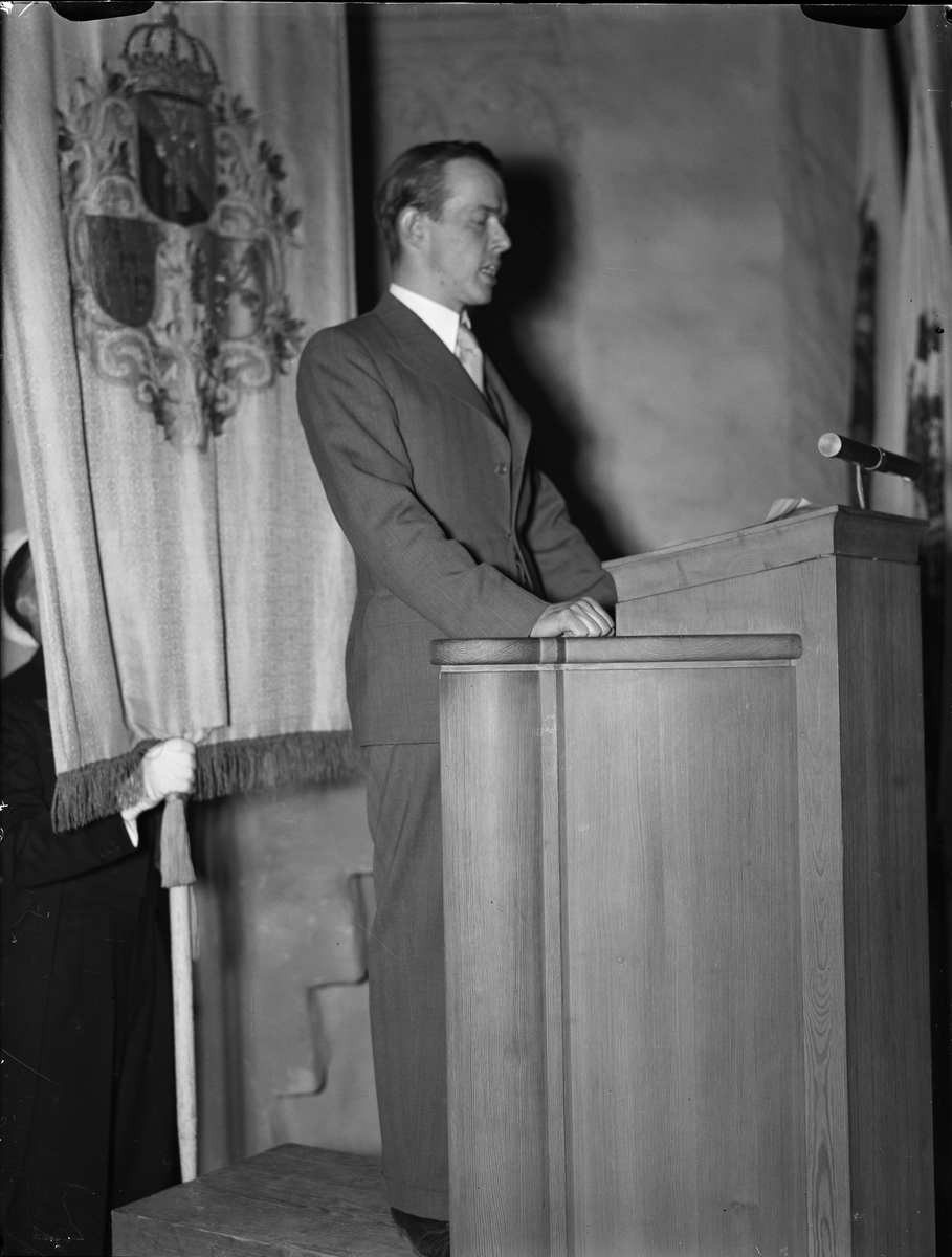 Hovrättsauskultant Heikki von Hertzen "framför de finska studenternas hälsning" på Uppsala Studentkårs vårfest i Rikssalen, Uppsala slott