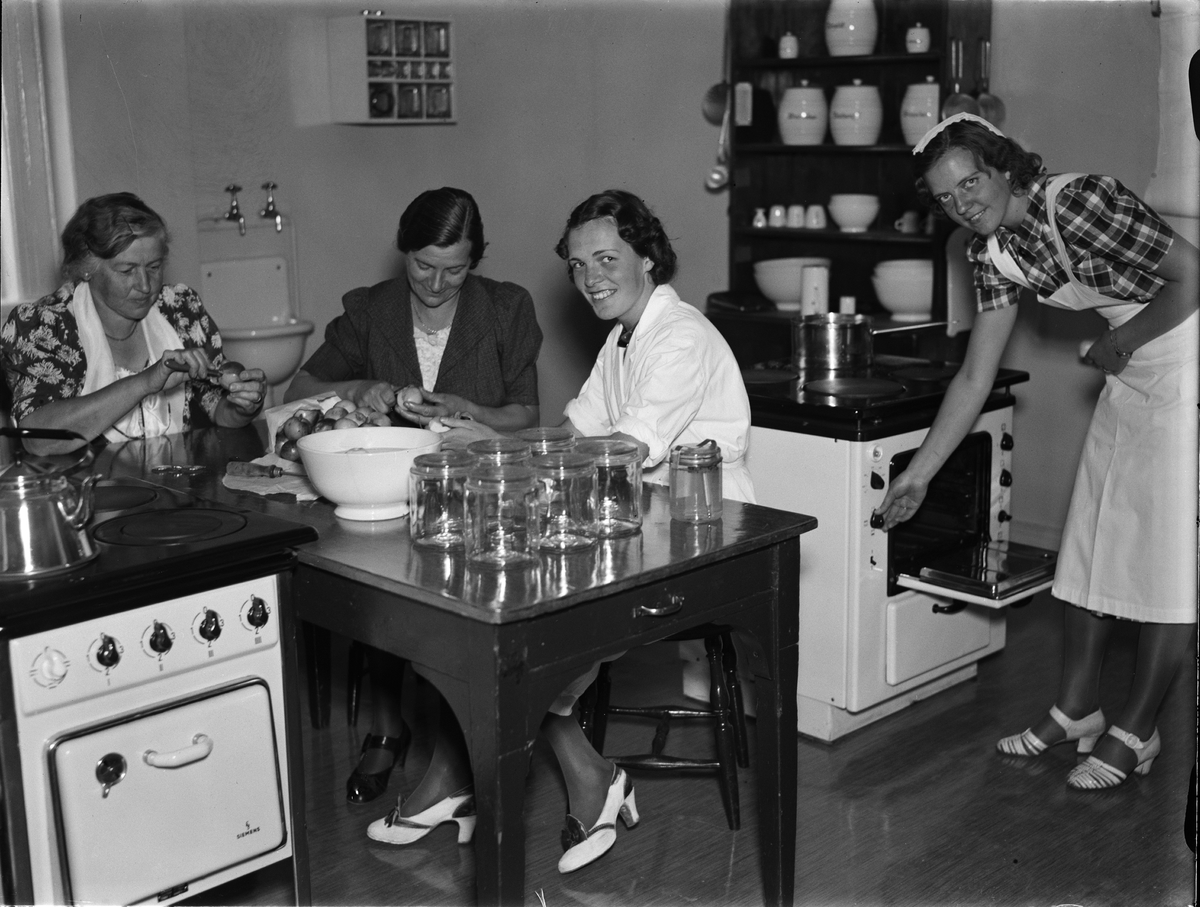 Husmödrar på "Elverkets" konserveringskurs i Fackskolan för huslig ekonomis "elektriska kök", Trädgårdsgatan 14. till höger kursledaren "skolkökslärarinnan fröken Werner"