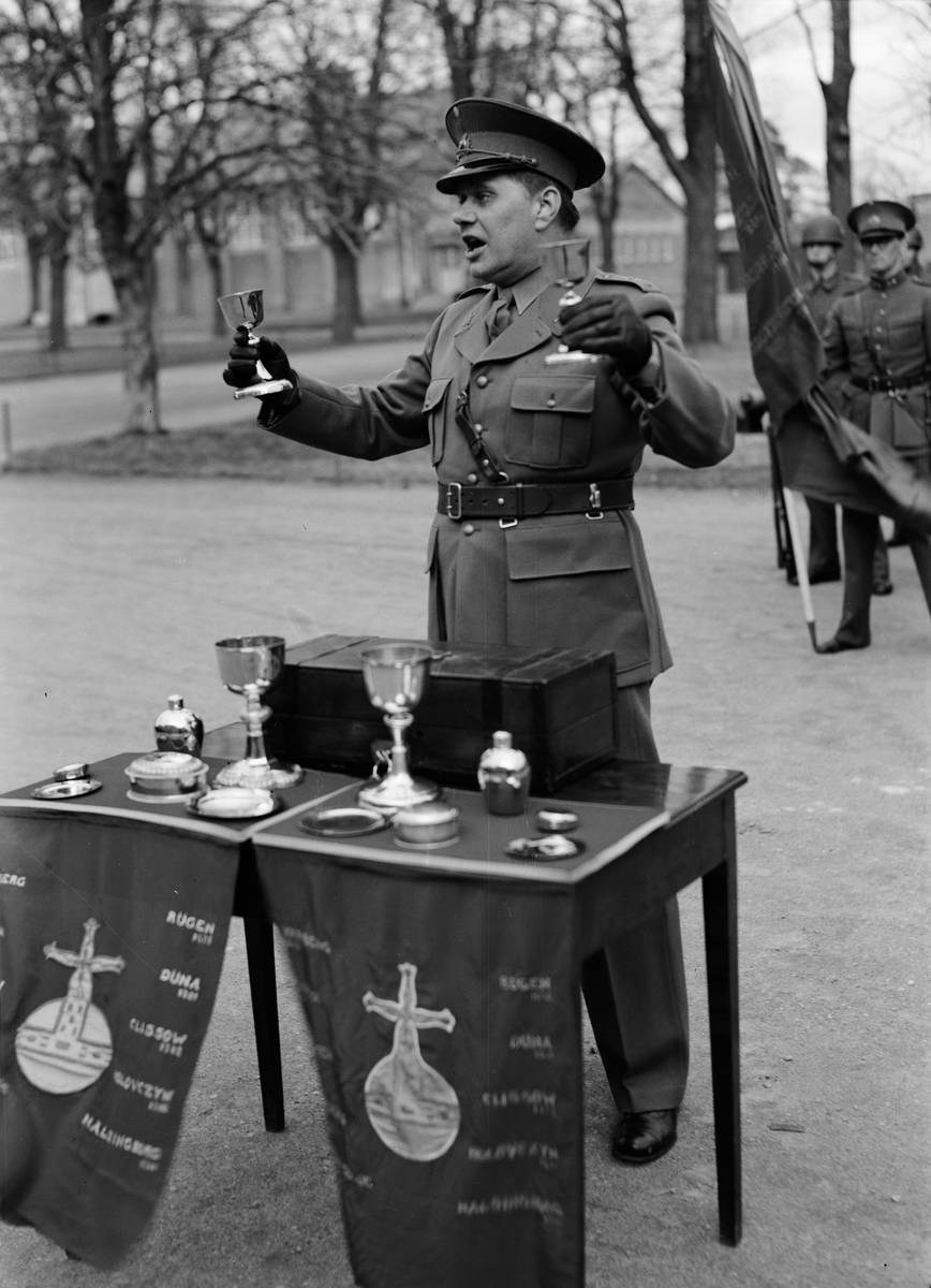 Kapten Carl Söderberg förevisar regementets nattvardskärl vid återinvigningen av Upplands Regementes bibliotek och mässar för manskap och befäl under utbildning