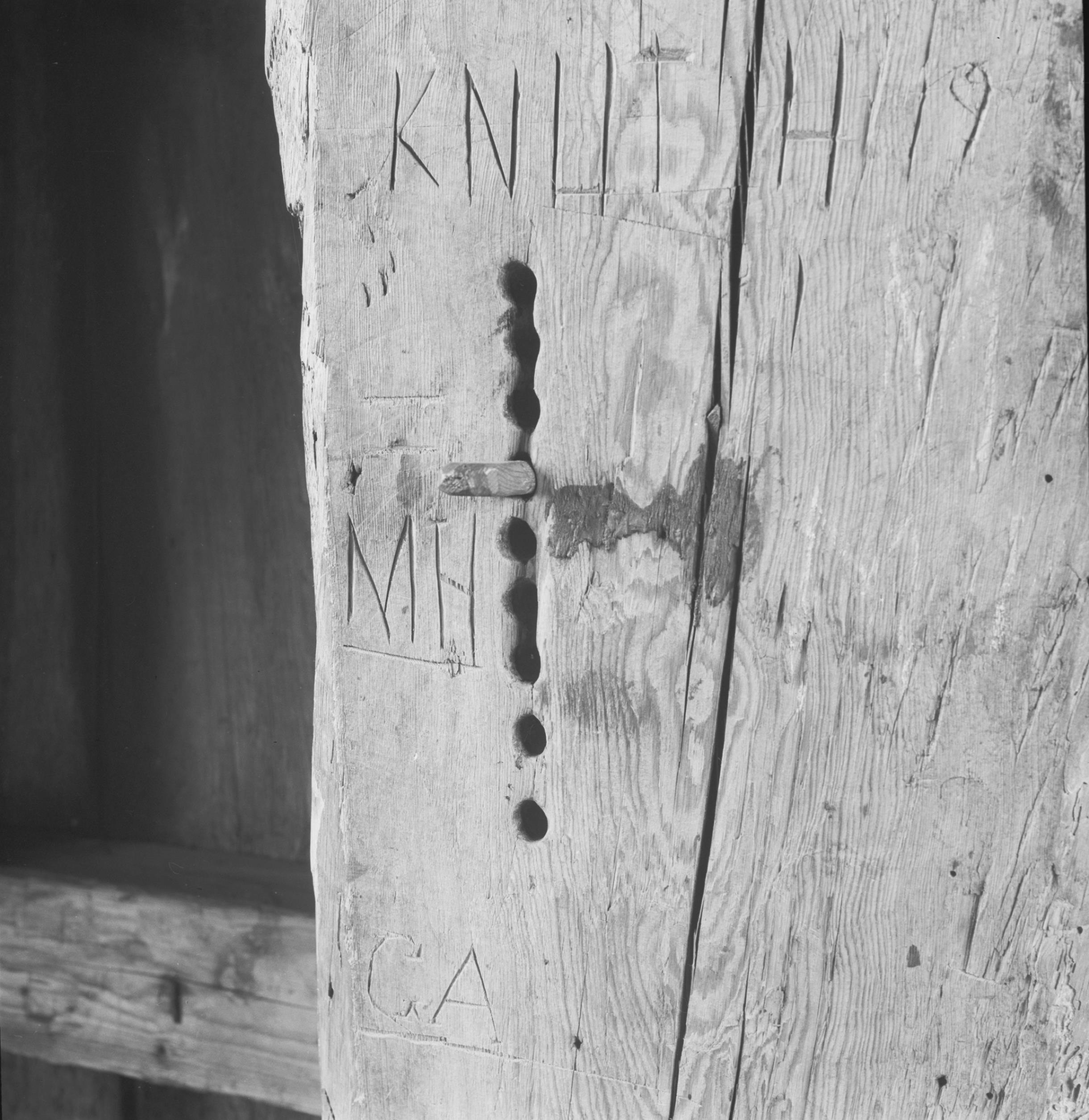 Klockstapeln, parti av hjärtstocken i klockvåningen med nio hål för att räkna slagen vid klämtningen.