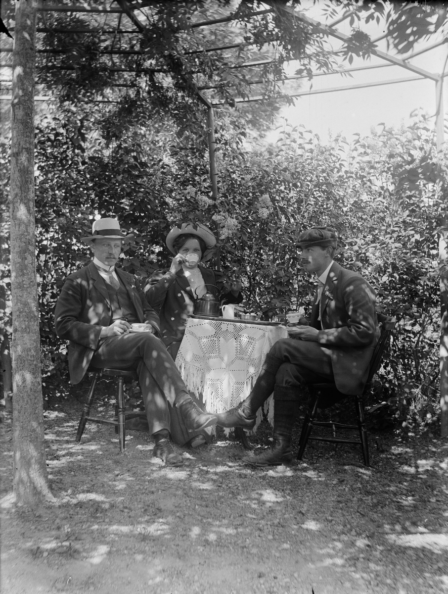 Kvinna och två män vid kaffebordet i bersån
