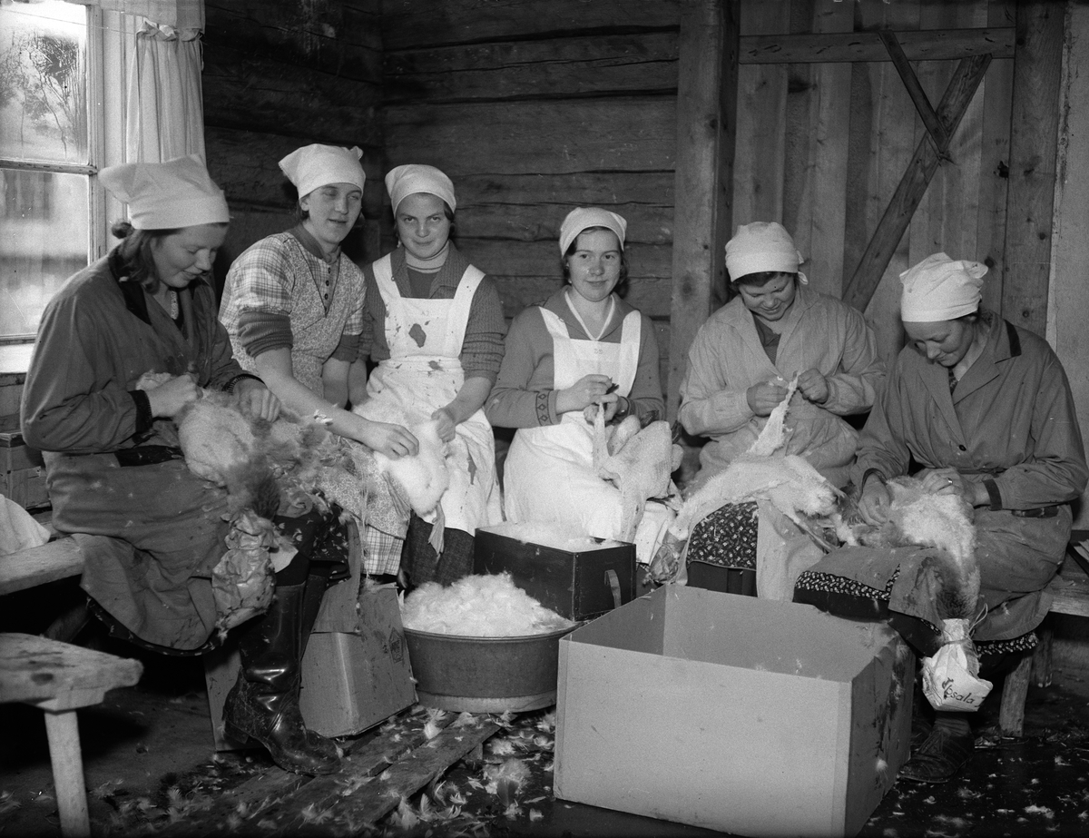 Unga kvinnor plockar dun på Danmarks JUF:s kurs i fjäderfäslakt i ett brygghus intill Danmarks hembygdsgård