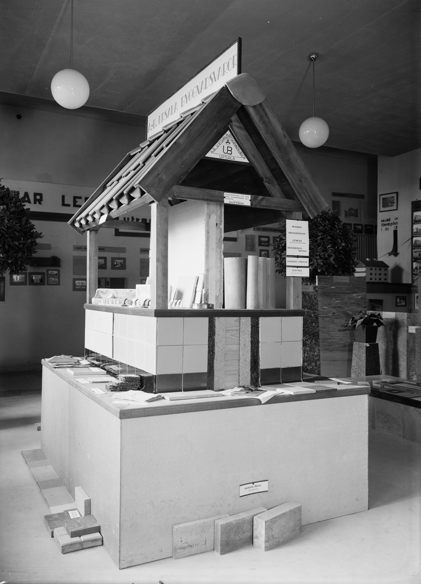 AB Upsala Byggnadsvarors monter i avdelningen för byggnadsmaterial på Upsala Fabriks- och Handtverksförenings utställning, nedre botten, kvarteret Näktergalen, Stora Torget