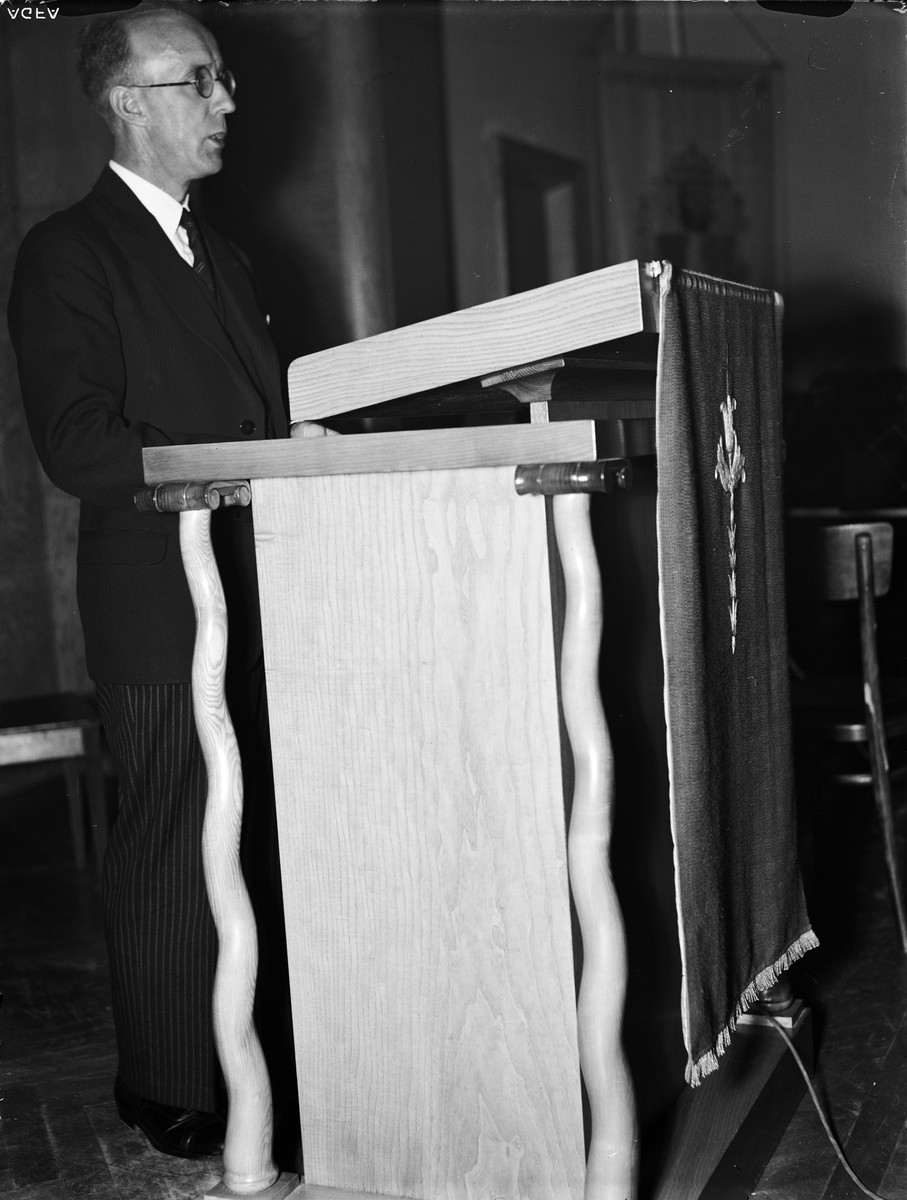 Utställningsbestyrelsens ordförande Karl Söderberg talar vid invigningen av utställningen Vi unga i KFUM-borgens hörsal