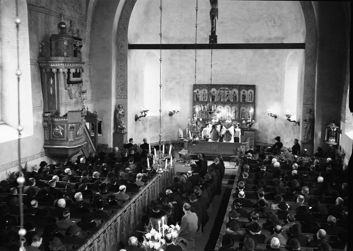 Biskop Tor Andrae och ärkebiskop Erling Eidem förrättar högmässan i samband med firandet av Gamla Uppsala kyrkas 800-årsjubileum