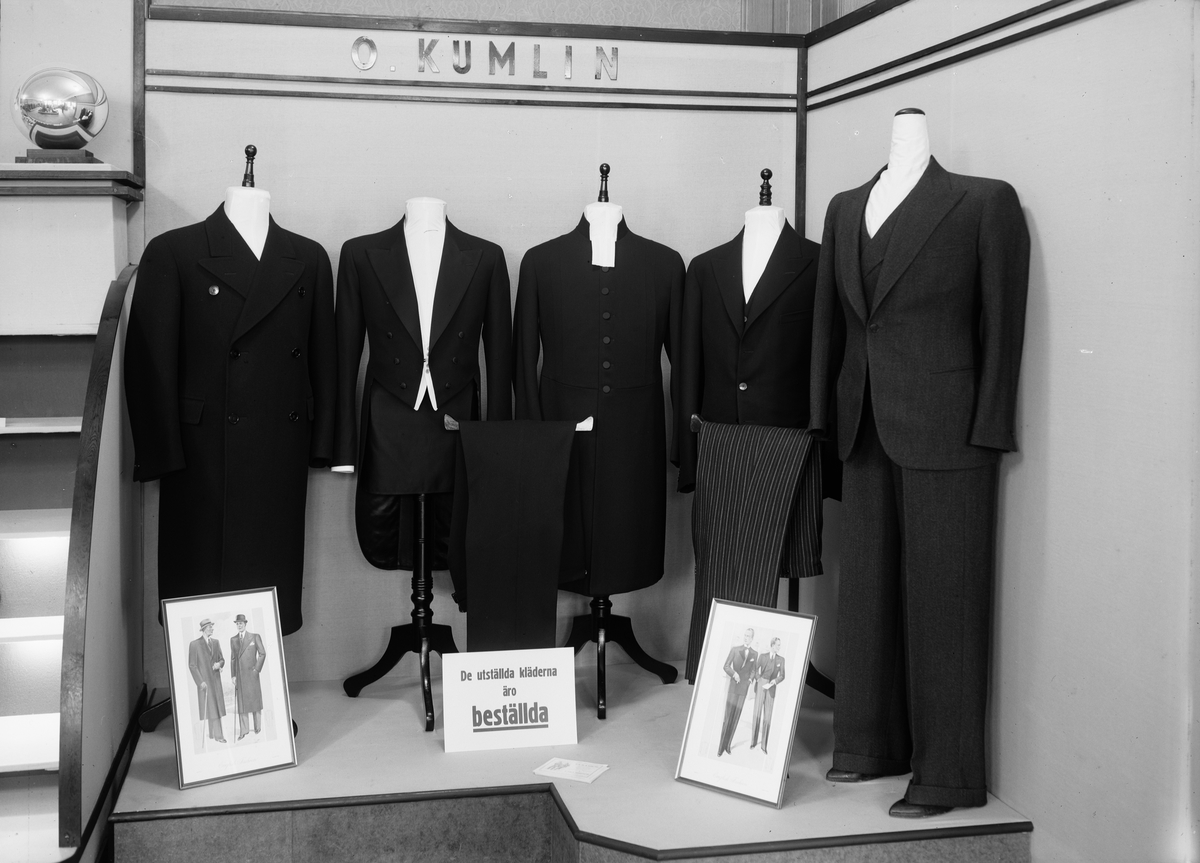 Skräddarmästare Oscar Kumlins monter i beklädnadsavdelningen på Upsala Fabriks- och handtverksförenings utställning, en trappa upp, Nedre Slottsgatan 6