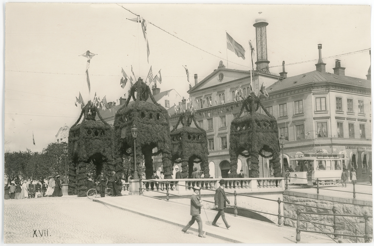 Nybron smyckad med pyloner i samband med Linnéjubileet, Uppsala 1907