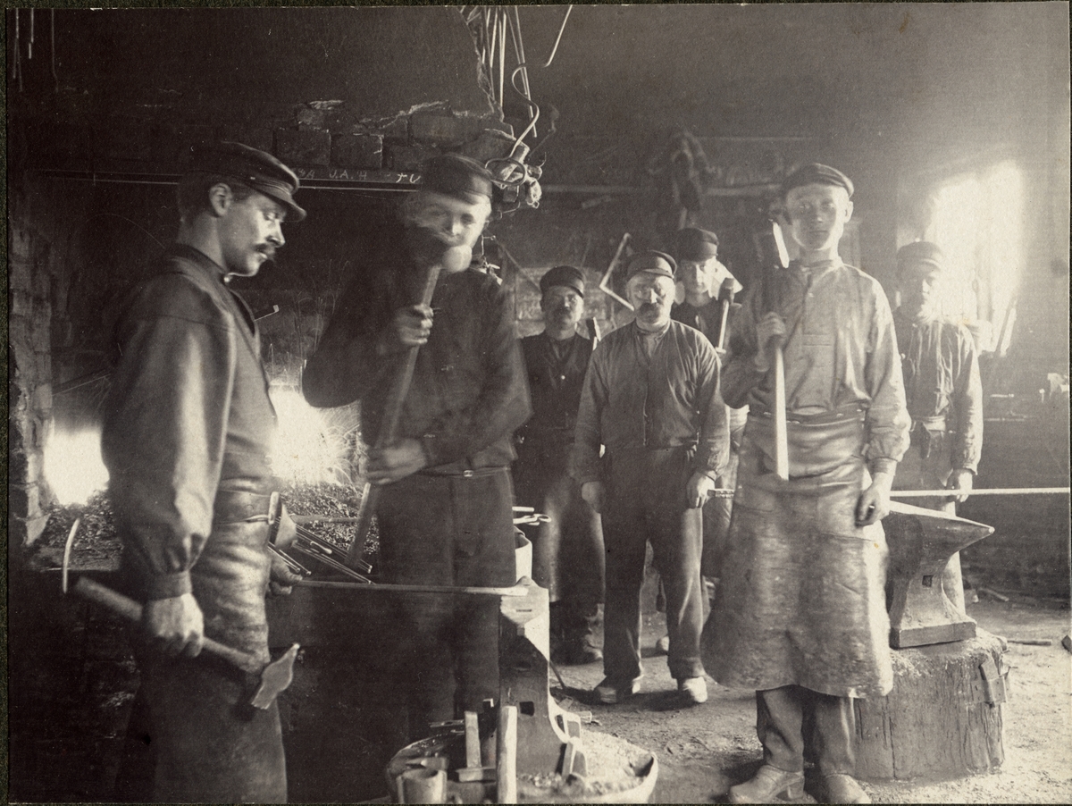 Arbetare i kvarnsmedjan, Akademikvarnen, kvarteret Holmen, Uppsala juni 1909