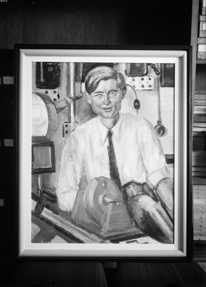 Oljemålning - konstnären Isaac Grünewalds porträtt av professor The Svedberg, placerat i Fysikalisk-kemiska institutionens bibliotek