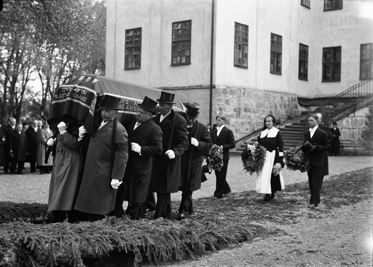 "Kistan bärs ut från Salsta slottskapell" för färd till Lena kyrka - friherre Fredrik von Essens jordfästning